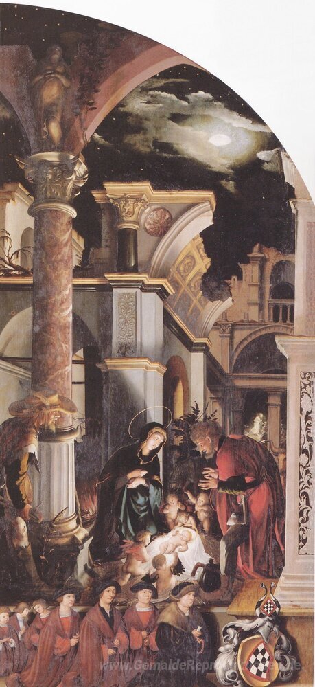 Wir bieten Ihnen eine handgefertigte Reproduktion auf Leinwand des berühmten Kunstwerks 'Oberried Altarbild mit der rechten Innenflügel - Die Geburt Chri' von Hans Holbein the Younger, aus dem Reproduktionsmuseum.