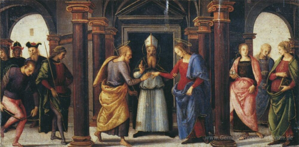 Wir bieten Ihnen eine handgefertigte Reproduktion auf Leinwand des berühmten Kunstwerks 'Pala di Fano (Hochzeit der Jungfrau)' von Pietro Perugino, aus dem Reproduktionsmuseum.
