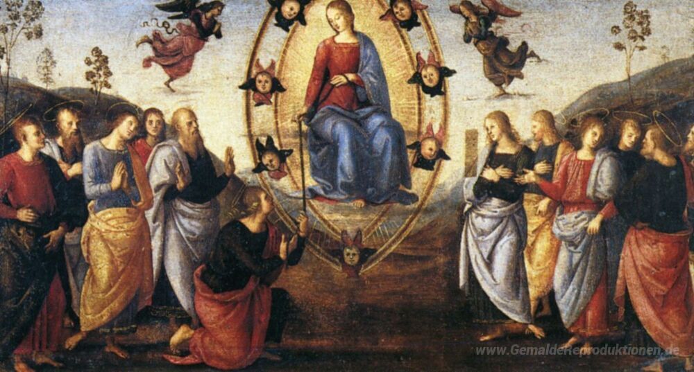 Wir bieten Ihnen eine handgefertigte Reproduktion auf Leinwand des berühmten Kunstwerks 'Pala di Fano (Mariä Himmelfahrt)' von Pietro Perugino, aus dem Reproduktionsmuseum.