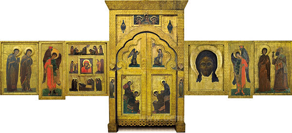 Wir bieten Ihnen eine handgefertigte Reproduktion auf Leinwand des berühmten Kunstwerks 'Perm Ikonostase' von Nicholas Roerich, aus dem Reproduktionsmuseum.
