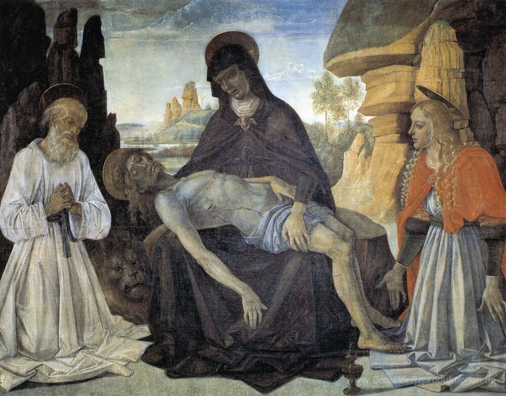 Wir bieten Ihnen eine handgefertigte Reproduktion auf Leinwand des berühmten Kunstwerks 'Pieta mit Heiligen Hieronymus und Santa Maria Magdalena' von Pietro Perugino, aus dem Reproduktionsmuseum.