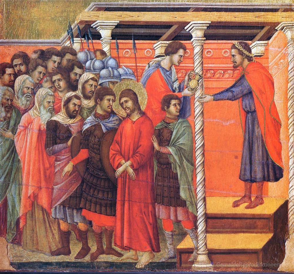 Wir bieten Ihnen eine handgefertigte Reproduktion auf Leinwand des berühmten Kunstwerks 'Pilatus wäscht sich die Hände' von Duccio, aus dem Reproduktionsmuseum.