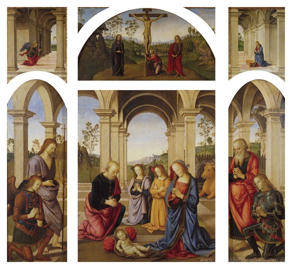 Wir bieten Ihnen eine handgefertigte Reproduktion auf Leinwand des berühmten Kunstwerks 'Polyptych Albani Torlonia' von Pietro Perugino, aus dem Reproduktionsmuseum.