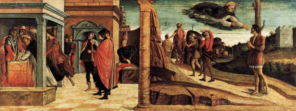 Wir bieten Ihnen eine handgefertigte Reproduktion auf Leinwand des berühmten Kunstwerks 'Polyptych von San Vincenzo Ferreri' von Giovanni Bellini, aus dem Reproduktionsmuseum.
