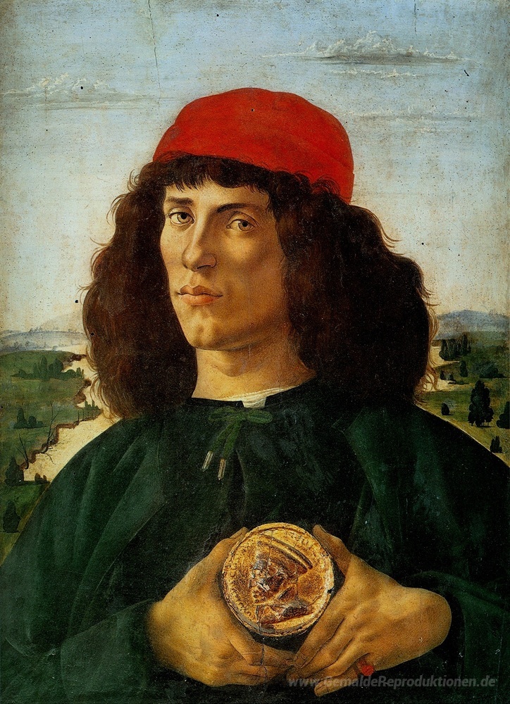 Wir bieten Ihnen eine handgefertigte Reproduktion auf Leinwand des berühmten Kunstwerks 'Porträt eines Mannes mit der Medaille von Cosimo' von Sandro Botticelli, aus dem Reproduktionsmuseum.