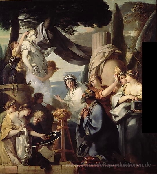 Wir bieten Ihnen eine handgefertigte Reproduktion auf Leinwand des berühmten Kunstwerks 'Salomo, der ein Opfer den Götzen' von Sebastien Bourdon, aus dem Reproduktionsmuseum.