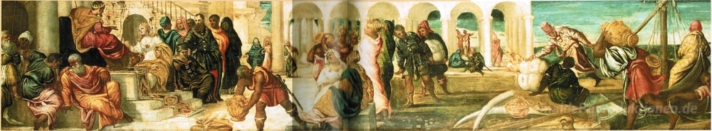 Wir bieten Ihnen eine handgefertigte Reproduktion auf Leinwand des berühmten Kunstwerks 'Salomon und die Königin von Saba' von Tintoretto, aus dem Reproduktionsmuseum.