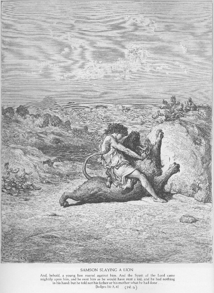 Wir bieten Ihnen eine handgefertigte Reproduktion auf Leinwand des berühmten Kunstwerks 'Samson tötet einen Löwen' von Gustave Dore, aus dem Reproduktionsmuseum.