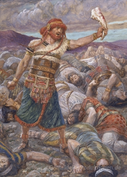 Wir bieten Ihnen eine handgefertigte Reproduktion auf Leinwand des berühmten Kunstwerks 'Samson tötet tausend Mann' von James Tissot, aus dem Reproduktionsmuseum.