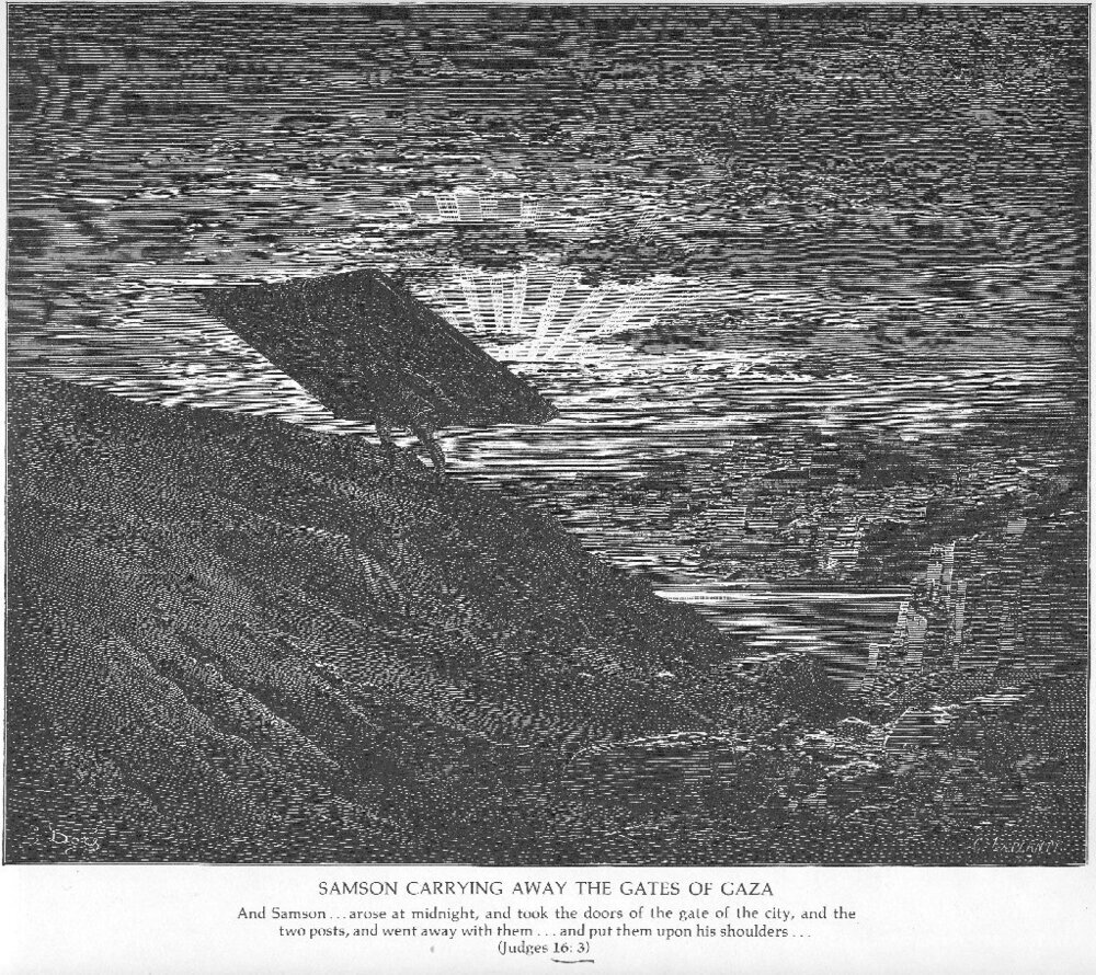 Wir bieten Ihnen eine handgefertigte Reproduktion auf Leinwand des berühmten Kunstwerks 'Samson wegträgt die Tore von Gaza' von Gustave Dore, aus dem Reproduktionsmuseum.