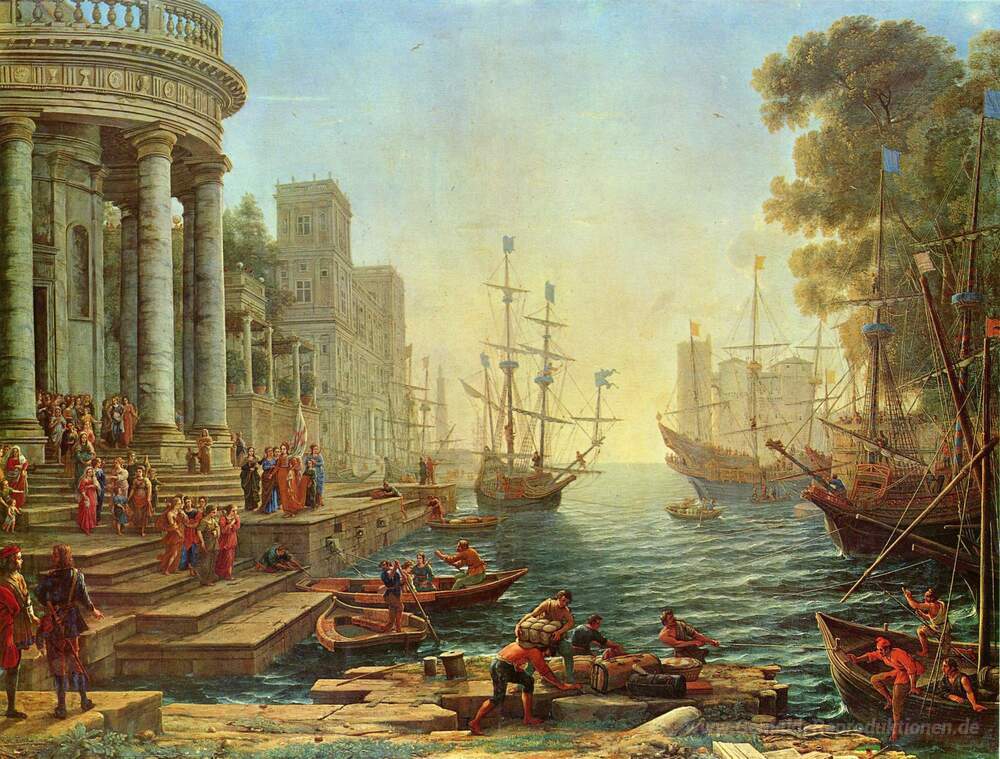 Wir bieten Ihnen eine handgefertigte Reproduktion auf Leinwand des berühmten Kunstwerks 'Seehafen mit der Einschiffung von St Ursula' von Claude Lorrain, aus dem Reproduktionsmuseum.