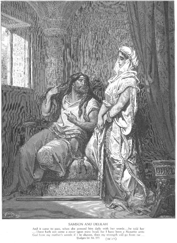 Wir bieten Ihnen eine handgefertigte Reproduktion auf Leinwand des berühmten Kunstwerks 'Simson und Delila' von Gustave Dore, aus dem Reproduktionsmuseum.