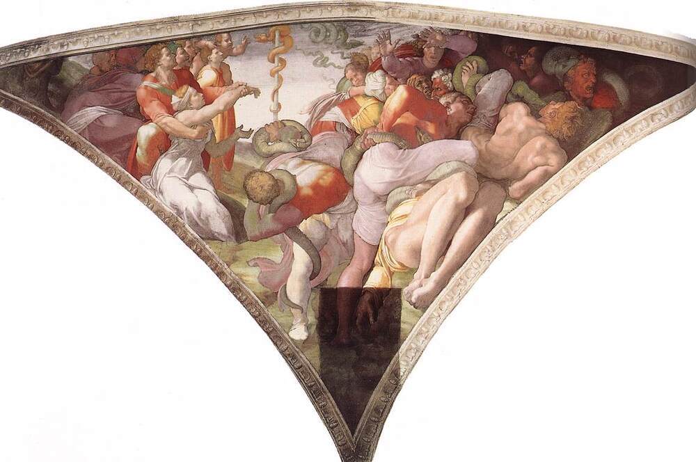 Wir bieten Ihnen eine handgefertigte Reproduktion auf Leinwand des berühmten Kunstwerks 'Sistine Kapellen-Decke: die eherne Schlange' von Michelangelo, aus dem Reproduktionsmuseum.