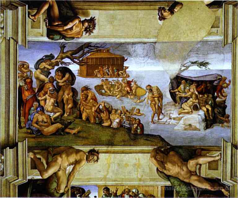 Wir bieten Ihnen eine handgefertigte Reproduktion auf Leinwand des berühmten Kunstwerks 'Sistine Kapellen-Decke: Die Sintflut' von Michelangelo, aus dem Reproduktionsmuseum.