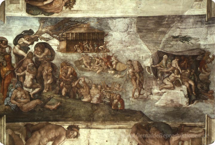 Wir bieten Ihnen eine handgefertigte Reproduktion auf Leinwand des berühmten Kunstwerks 'Sistine Kapellen-Decke: Die Sintflut' von Michelangelo, aus dem Reproduktionsmuseum.