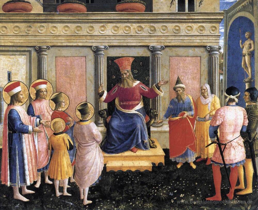 Wir bieten Ihnen eine handgefertigte Reproduktion auf Leinwand des berühmten Kunstwerks 'St. Cosmas und St. Damian vor Lisius' von Fra Angelico, aus dem Reproduktionsmuseum.