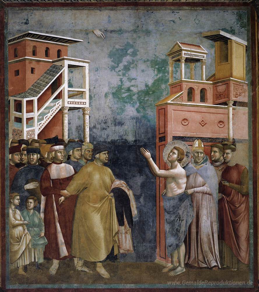 Wir bieten Ihnen eine handgefertigte Reproduktion auf Leinwand des berühmten Kunstwerks 'St. Francis verzichtet auf alle weltlichen Güter' von Giotto, aus dem Reproduktionsmuseum.