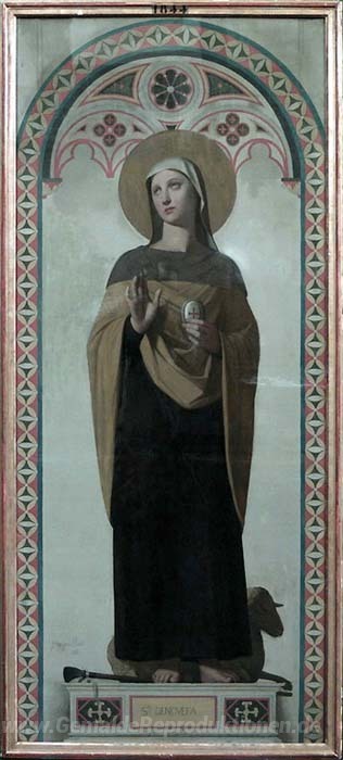 Wir bieten Ihnen eine handgefertigte Reproduktion auf Leinwand des berühmten Kunstwerks 'St. Genevieve, der Patronin von Paris' von Jean Auguste Dominique Ingres, aus dem Reproduktionsmuseum.