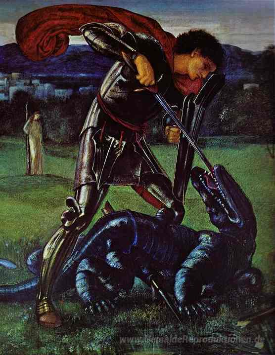 Wir bieten Ihnen eine handgefertigte Reproduktion auf Leinwand des berühmten Kunstwerks 'St. Georg und der Drache' von Edward Burne-Jones, aus dem Reproduktionsmuseum.