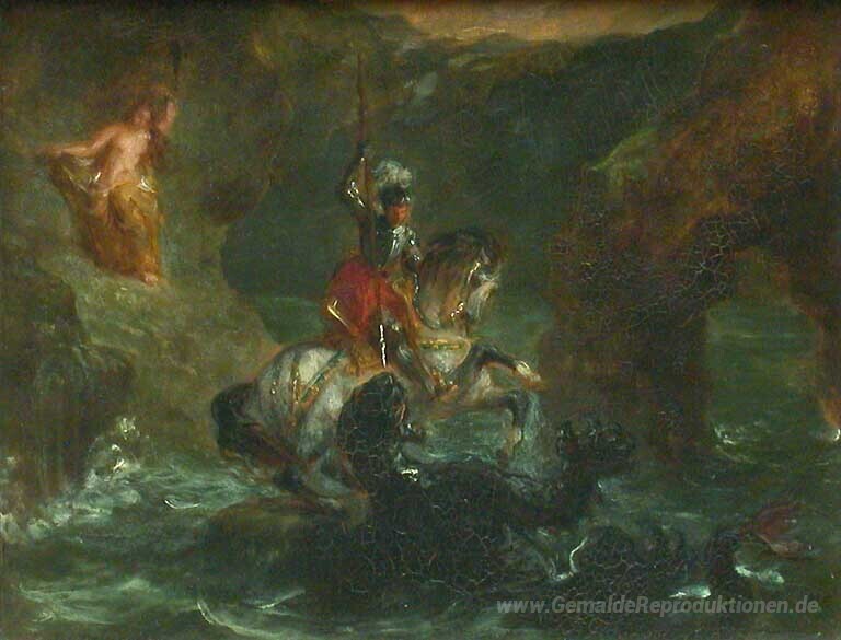Wir bieten Ihnen eine handgefertigte Reproduktion auf Leinwand des berühmten Kunstwerks 'St George, das den Drachen, Perseus Andromeda Liefern' von Eugene Delacroix, aus dem Reproduktionsmuseum.