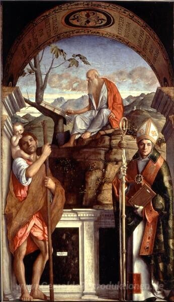 Wir bieten Ihnen eine handgefertigte Reproduktion auf Leinwand des berühmten Kunstwerks 'St. Jerome, St. Christoph und St. Augustine' von Giovanni Bellini, aus dem Reproduktionsmuseum.