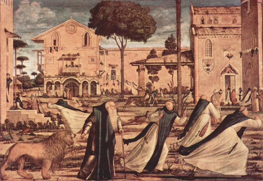 Wir bieten Ihnen eine handgefertigte Reproduktion auf Leinwand des berühmten Kunstwerks 'St. Jerome und Löwe im Kloster' von Vittore Carpaccio, aus dem Reproduktionsmuseum.