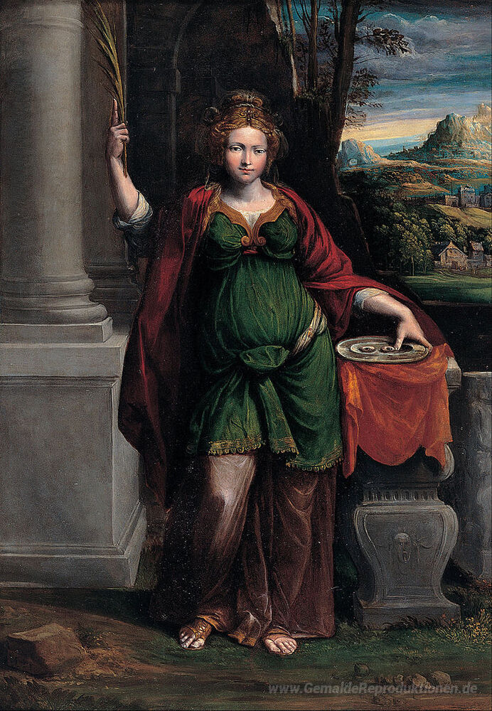 Wir bieten Ihnen eine handgefertigte Reproduktion auf Leinwand des berühmten Kunstwerks 'St. Lucy' von Benvenuto Tisi, aus dem Reproduktionsmuseum.