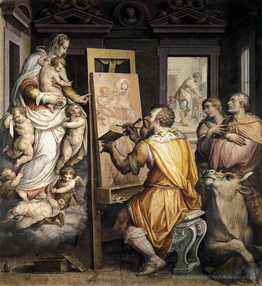 Wir bieten Ihnen eine handgefertigte Reproduktion auf Leinwand des berühmten Kunstwerks 'St. Lukas malt die Madonna' von Giorgio Vasari, aus dem Reproduktionsmuseum.