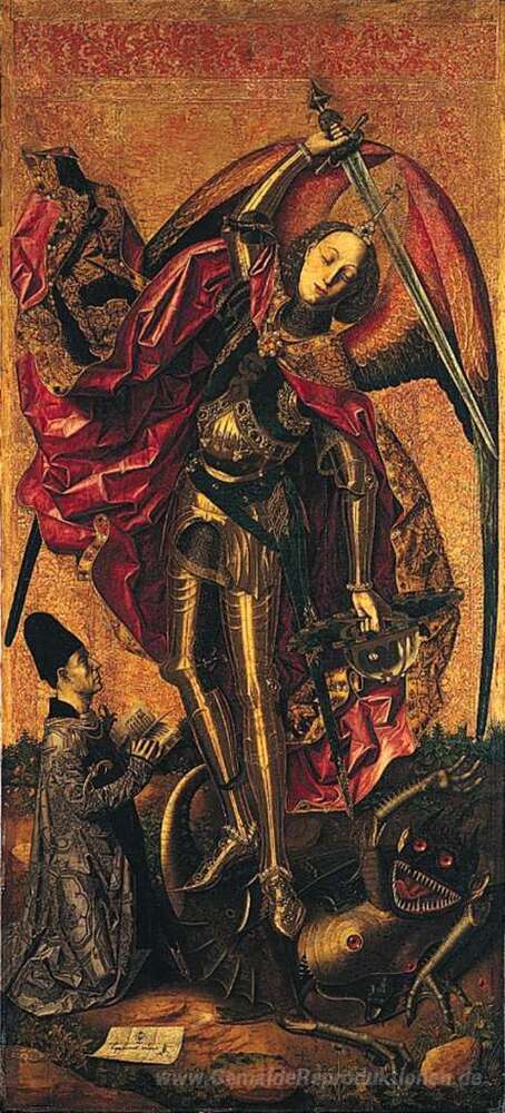 Wir bieten Ihnen eine handgefertigte Reproduktion auf Leinwand des berühmten Kunstwerks 'St. Michael Triumphs über den Teufel' von Bartolome Bermejo, aus dem Reproduktionsmuseum.