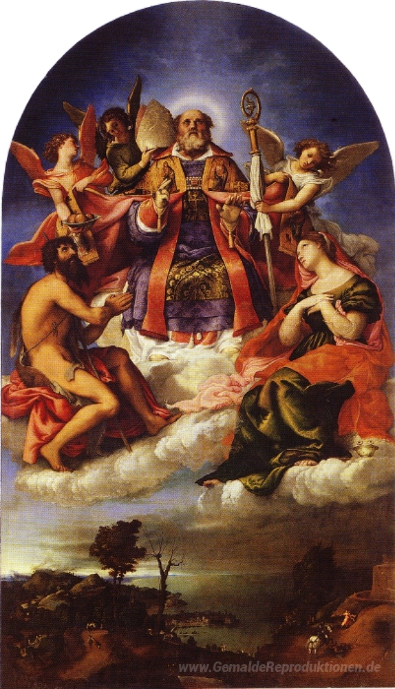 Wir bieten Ihnen eine handgefertigte Reproduktion auf Leinwand des berühmten Kunstwerks 'St. Nikolaus in der Glorie mit Johannes dem Täufer, St. Lucia un' von Lorenzo Lotto, aus dem Reproduktionsmuseum.