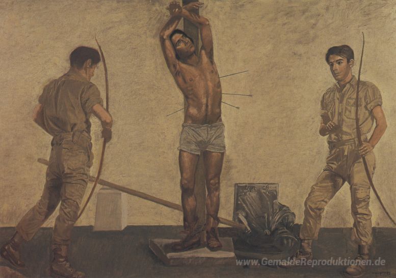 Wir bieten Ihnen eine handgefertigte Reproduktion auf Leinwand des berühmten Kunstwerks 'St. Sebastian' von Yiannis Tsaroychis, aus dem Reproduktionsmuseum.