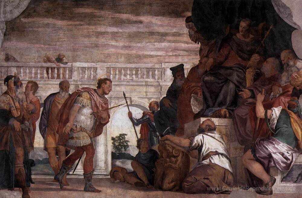 Wir bieten Ihnen eine handgefertigte Reproduktion auf Leinwand des berühmten Kunstwerks 'St. Sebastian zurechtweisend Diocletian' von Paolo Veronese, aus dem Reproduktionsmuseum.
