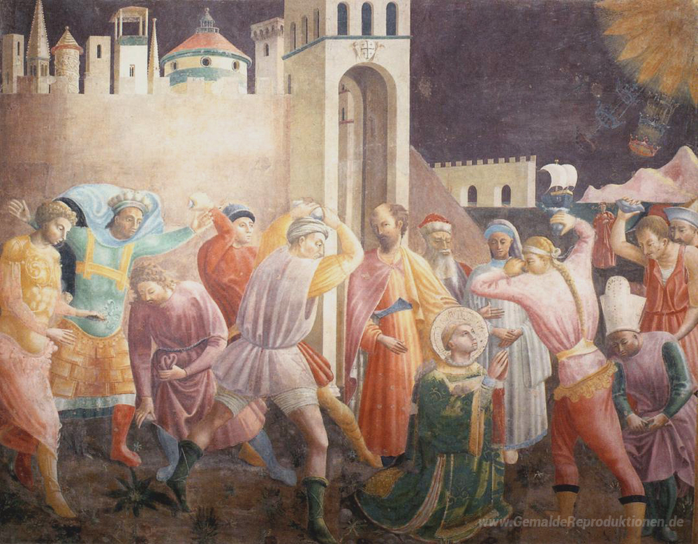 Wir bieten Ihnen eine handgefertigte Reproduktion auf Leinwand des berühmten Kunstwerks 'Steinigung des Stephanus' von Paolo Uccello, aus dem Reproduktionsmuseum.