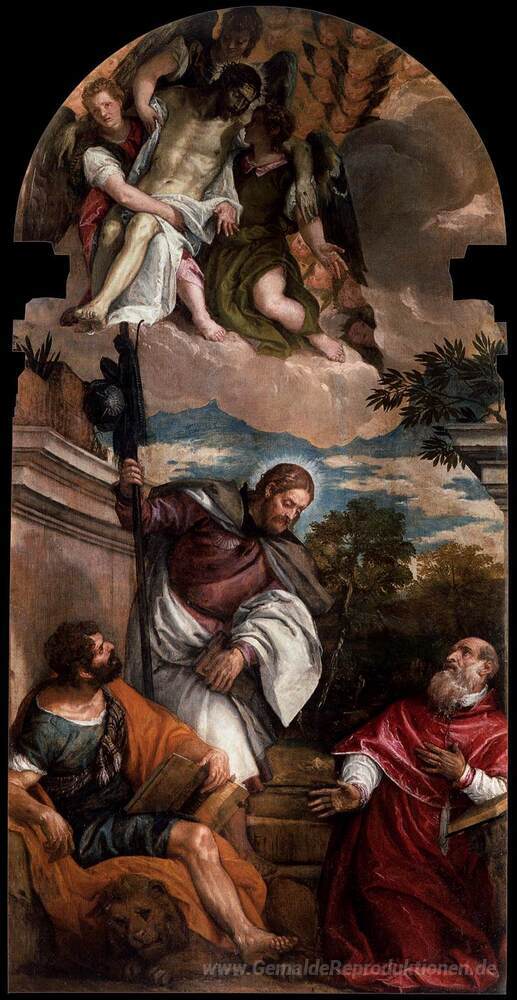 Wir bieten Ihnen eine handgefertigte Reproduktion auf Leinwand des berühmten Kunstwerks 'Sts Mark, James und Jerome mit dem toten Christus von Engeln Bor' von Paolo Veronese, aus dem Reproduktionsmuseum.