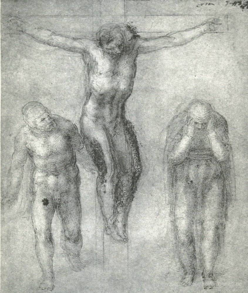 Wir bieten Ihnen eine handgefertigte Reproduktion auf Leinwand des berühmten Kunstwerks 'Studieren Sie für "Christus am Kreuz mit Trauernden"' von Michelangelo, aus dem Reproduktionsmuseum.