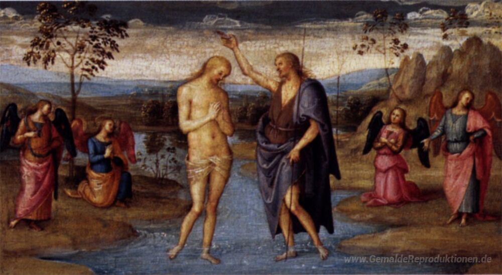 Wir bieten Ihnen eine handgefertigte Reproduktion auf Leinwand des berühmten Kunstwerks 'Taufe Christi' von Pietro Perugino, aus dem Reproduktionsmuseum.