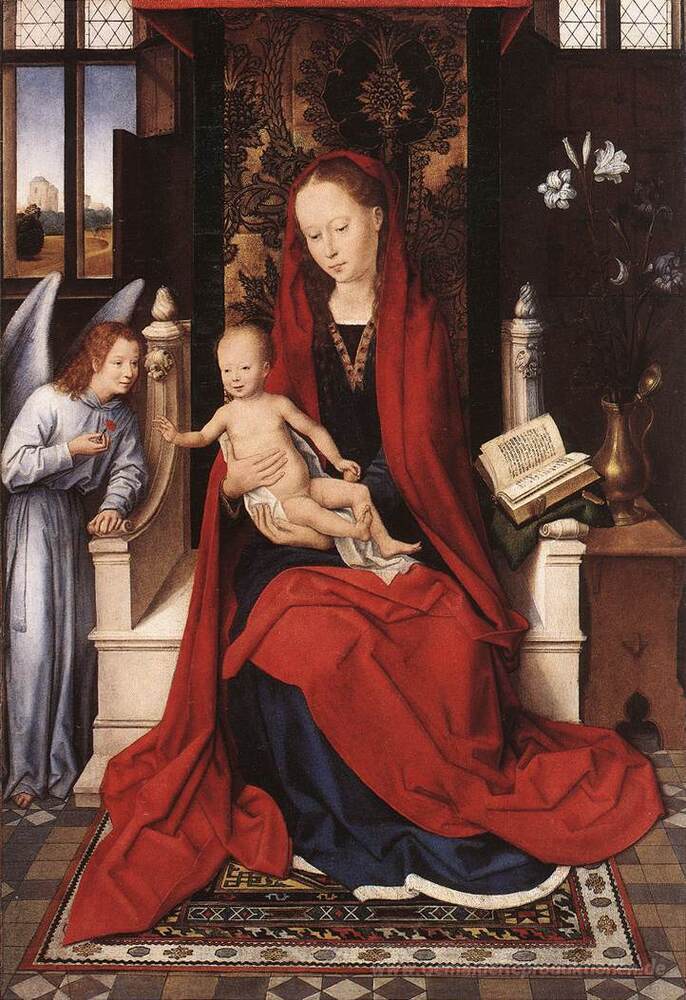 Wir bieten Ihnen eine handgefertigte Reproduktion auf Leinwand des berühmten Kunstwerks 'Thronende Maria mit Kind und Engel' von Hans Memling, aus dem Reproduktionsmuseum.