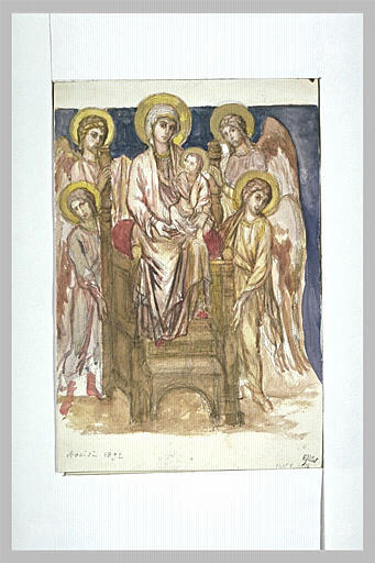 Wir bieten Ihnen eine handgefertigte Reproduktion auf Leinwand des berühmten Kunstwerks 'Thronende Maria mit Kind und Engeln' von Cimabue, aus dem Reproduktionsmuseum.