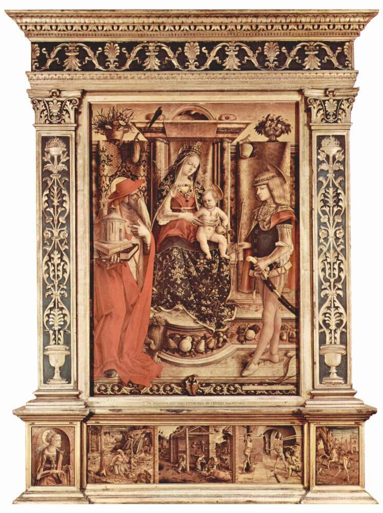 Wir bieten Ihnen eine handgefertigte Reproduktion auf Leinwand des berühmten Kunstwerks 'Thronende Maria, St. Hieronymus und St. Sebastian' von Carlo Crivelli, aus dem Reproduktionsmuseum.