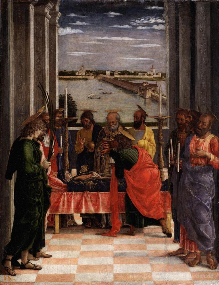 Wir bieten Ihnen eine handgefertigte Reproduktion auf Leinwand des berühmten Kunstwerks 'Tod der Jungfrau' von Andrea Mantegna, aus dem Reproduktionsmuseum.