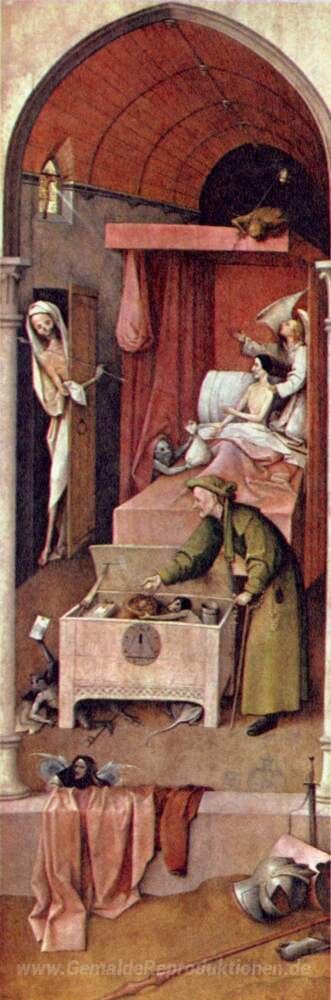 Wir bieten Ihnen eine handgefertigte Reproduktion auf Leinwand des berühmten Kunstwerks 'Tod des Geizhalses' von Hieronymus Bosch, aus dem Reproduktionsmuseum.