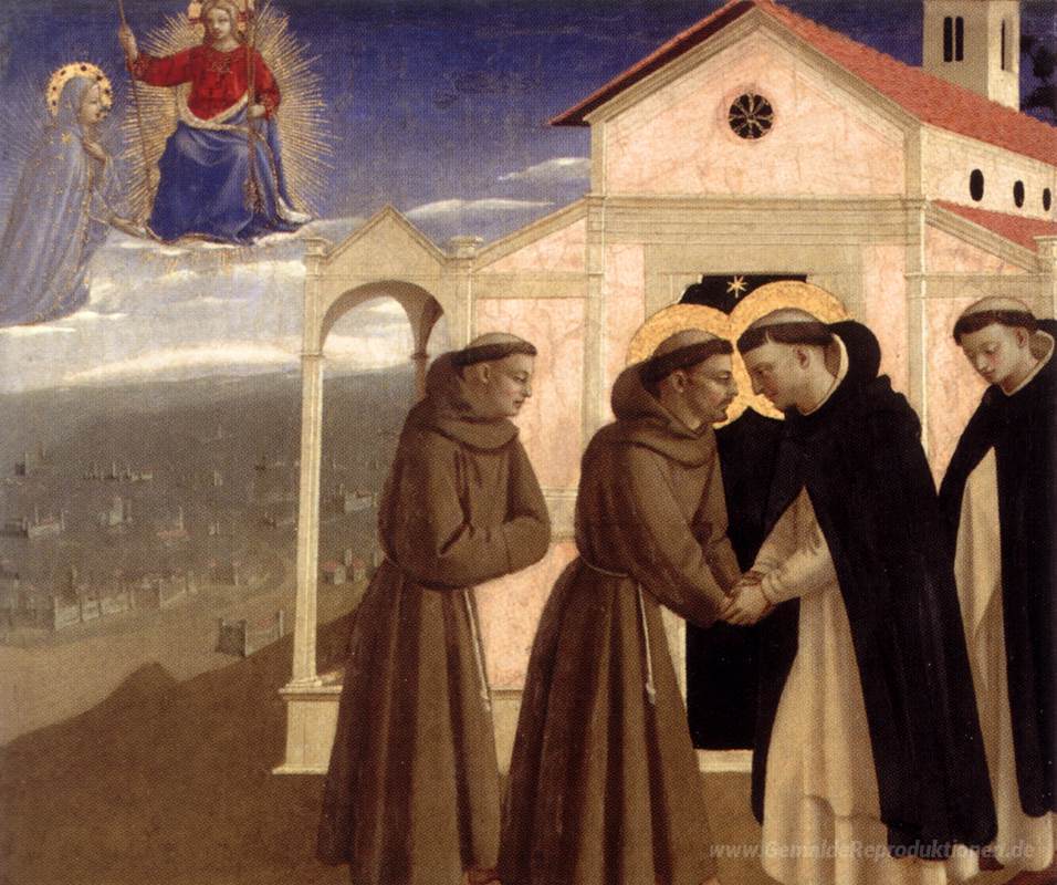 Wir bieten Ihnen eine handgefertigte Reproduktion auf Leinwand des berühmten Kunstwerks 'Treffen des Heiligen Franziskus und St. Dominikus' von Fra Angelico, aus dem Reproduktionsmuseum.
