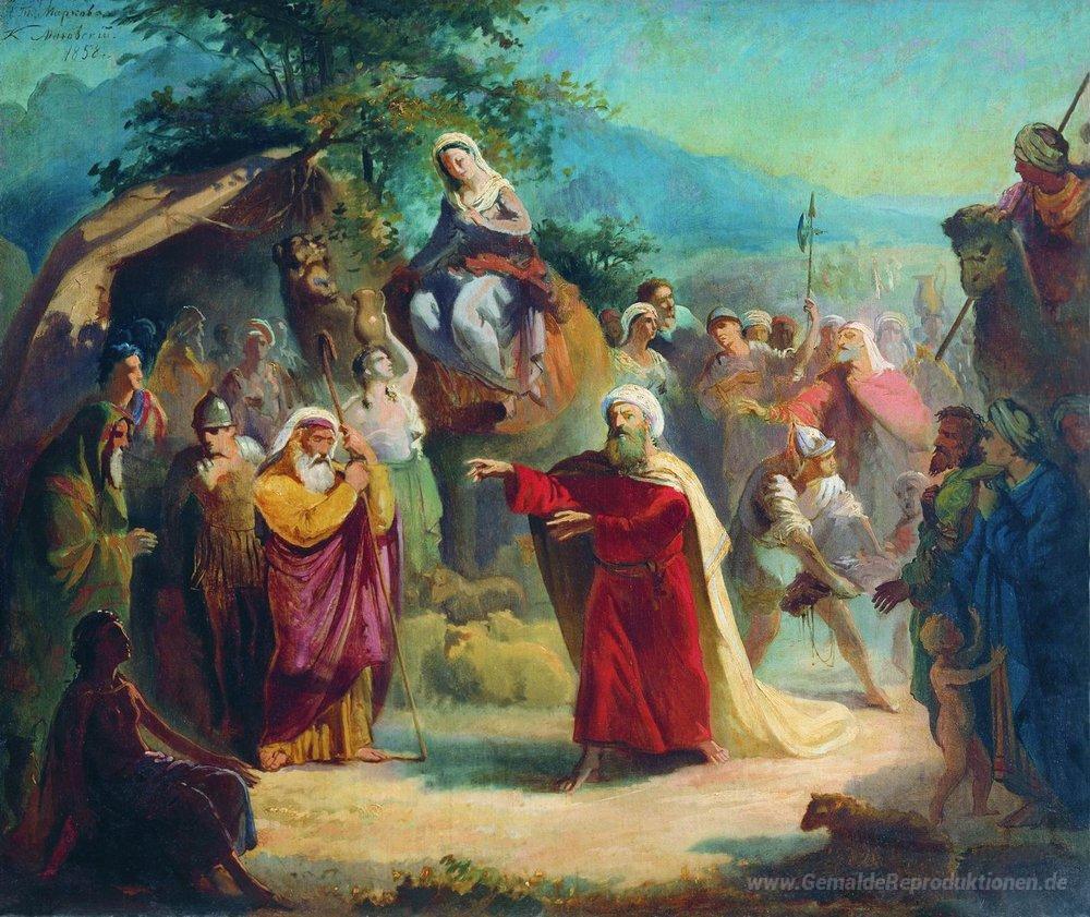 Willkommen in der faszinierenden Welt der Ölgemälde, in der Kunst und Emotion eine harmonische Verbindung eingehen. Unser Augenmerk liegt auf dem beeindruckenden Werk Treffen von Isaac und Eleazar des renommierten Künstler Konstantin Makovsky. Dieser Meister des 19. Jahrhunderts vereint in seinem Schaffen klassische Techniken mit einer einzigartigen Erzählweise, die den Betrachter in die Szenerie eintauchen lässt.