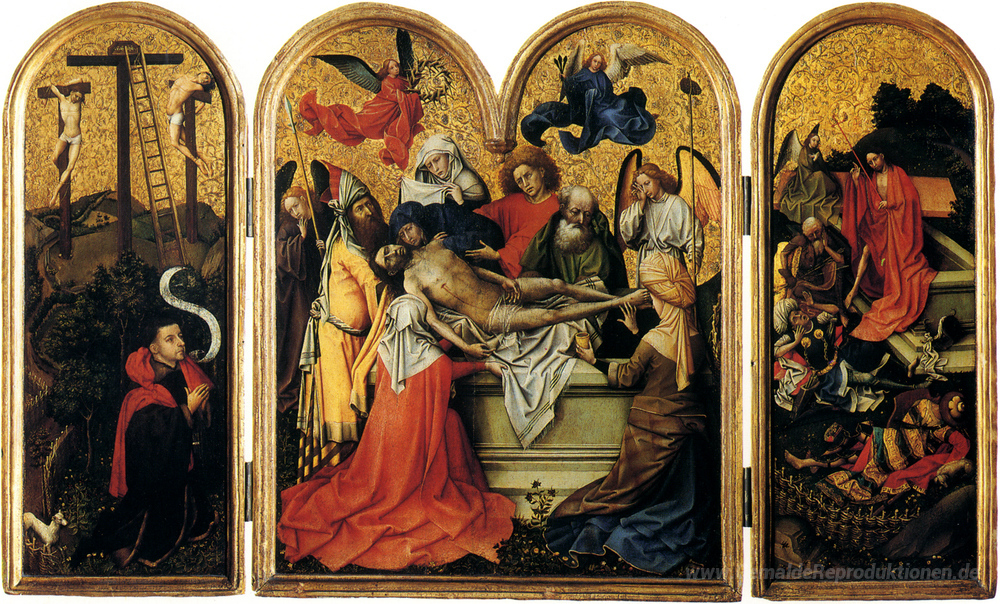 Wir bieten Ihnen eine handgefertigte Reproduktion auf Leinwand des berühmten Kunstwerks 'Triptychon: Die zwei Diebe mit dem leeren Kreuz, der Grablegung,' von Robert Campin, aus dem Reproduktionsmuseum.