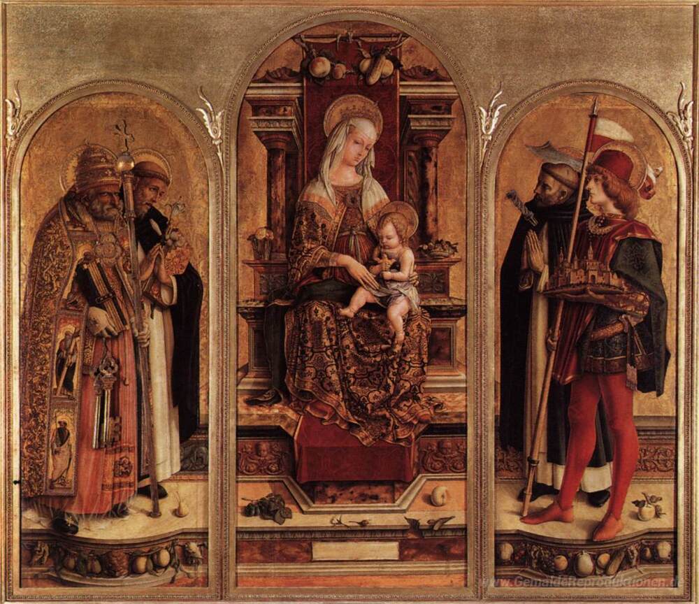 Wir bieten Ihnen eine handgefertigte Reproduktion auf Leinwand des berühmten Kunstwerks 'Triptychon von Camerino' von Carlo Crivelli, aus dem Reproduktionsmuseum.