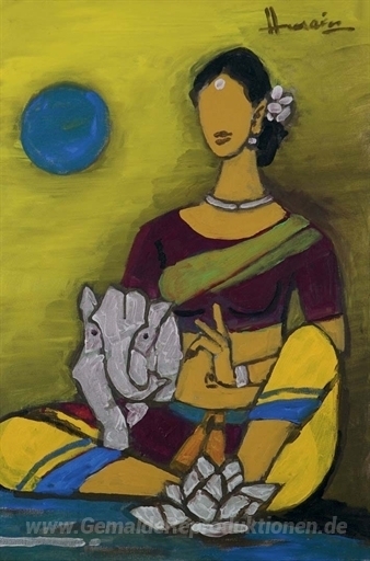 Wir bieten Ihnen eine handgefertigte Reproduktion auf Leinwand des berühmten Kunstwerks 'Untitled (Ganesha und Parvati)' von M.F. Husain, aus dem Reproduktionsmuseum.