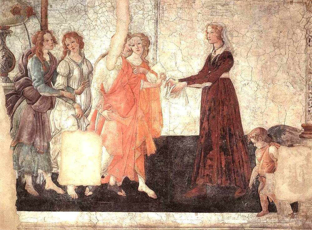 Wir bieten Ihnen eine handgefertigte Reproduktion auf Leinwand des berühmten Kunstwerks 'Venus und die Grazien mit Geschenken eines jungen Mädchens' von Sandro Botticelli, aus dem Reproduktionsmuseum.
