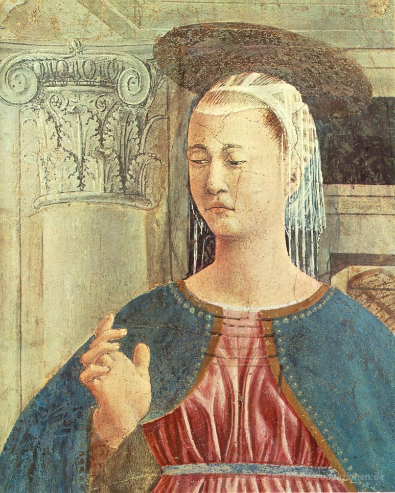Wir bieten Ihnen eine handgefertigte Reproduktion auf Leinwand des berühmten Kunstwerks 'Verkündigung (Detail)' von Piero della Francesca, aus dem Reproduktionsmuseum.
