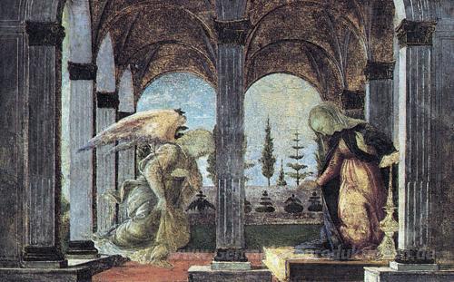 Wir bieten Ihnen eine handgefertigte Reproduktion auf Leinwand des berühmten Kunstwerks 'Verkündigung' von Sandro Botticelli, aus dem Reproduktionsmuseum.