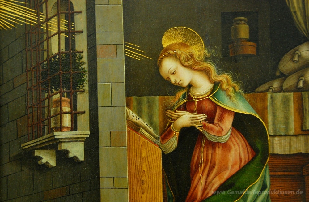 Wir bieten Ihnen eine handgefertigte Reproduktion auf Leinwand des berühmten Kunstwerks 'Verkündigung' von Carlo Crivelli, aus dem Reproduktionsmuseum.